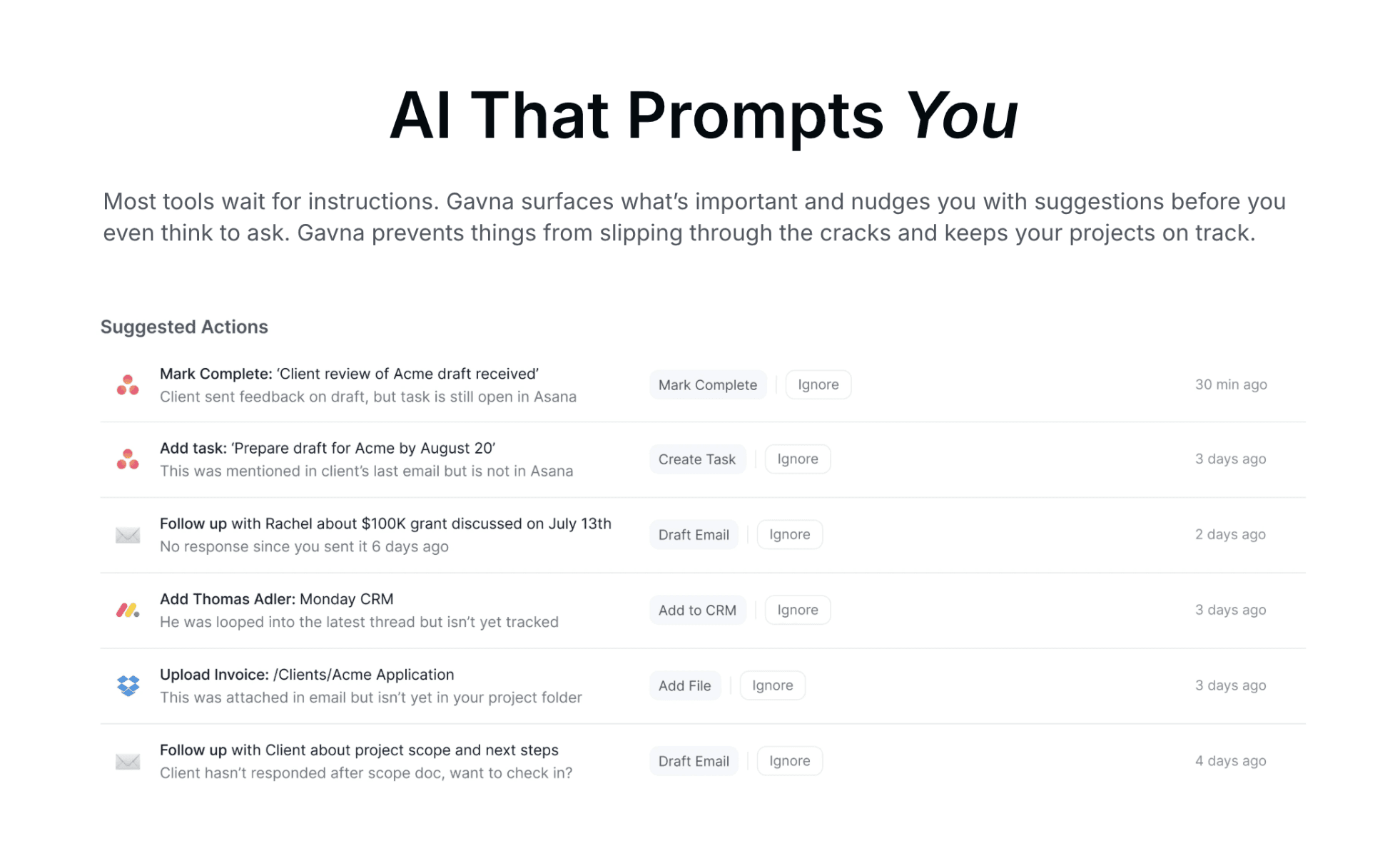 Your AI project manager that monitors your emails, meetings, and productivity tools to keep everything up to date, suggest next steps, and move work forward. Save 10+ hours each week and focus on growing your business, not just tracking it.