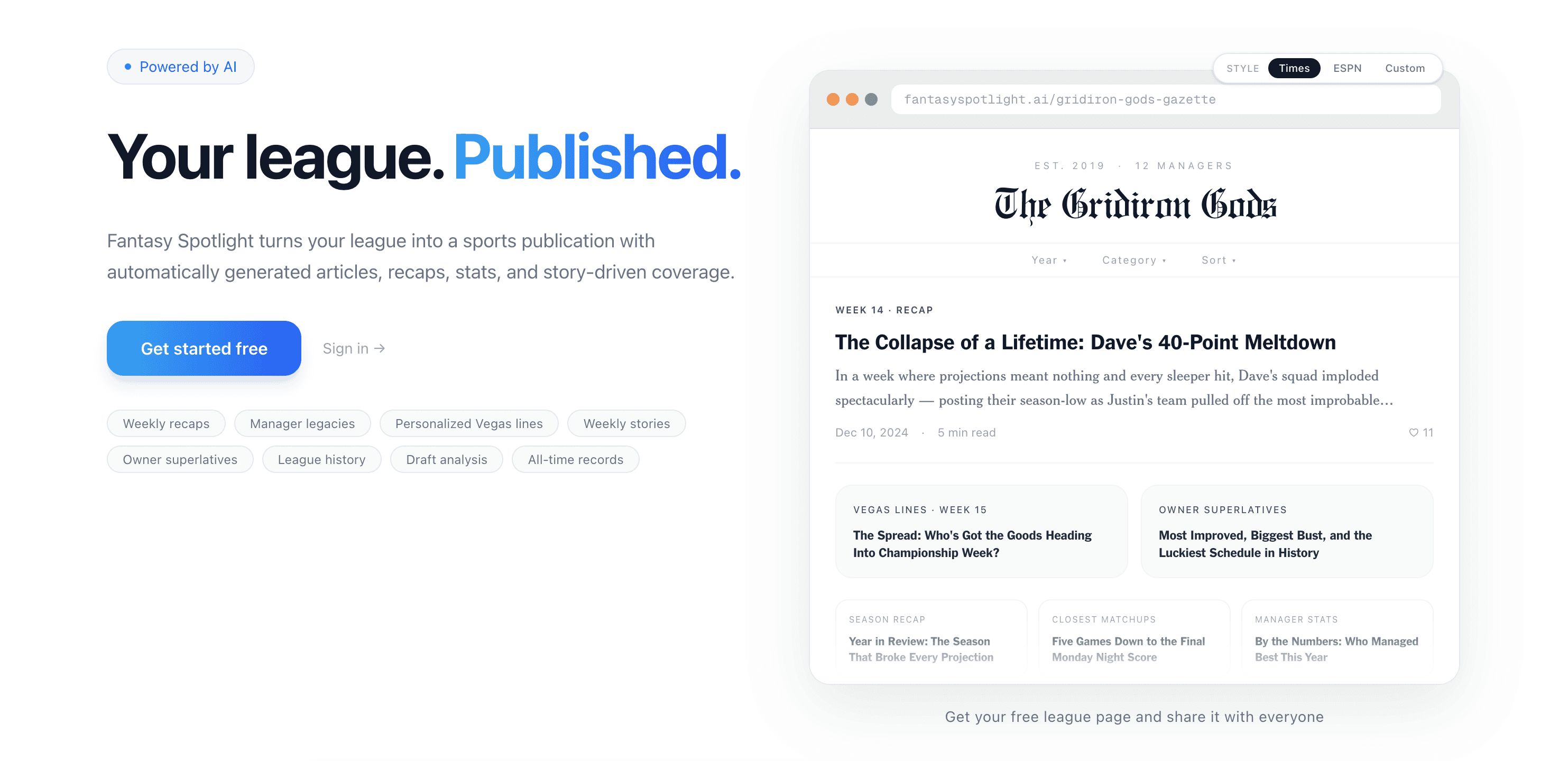 Turns every fantasy league into a live sports publication, automatically generating AI-powered articles, recaps, and story-driven coverage for your season. It gives every league its own shareable page, personalized and built just for your friends.