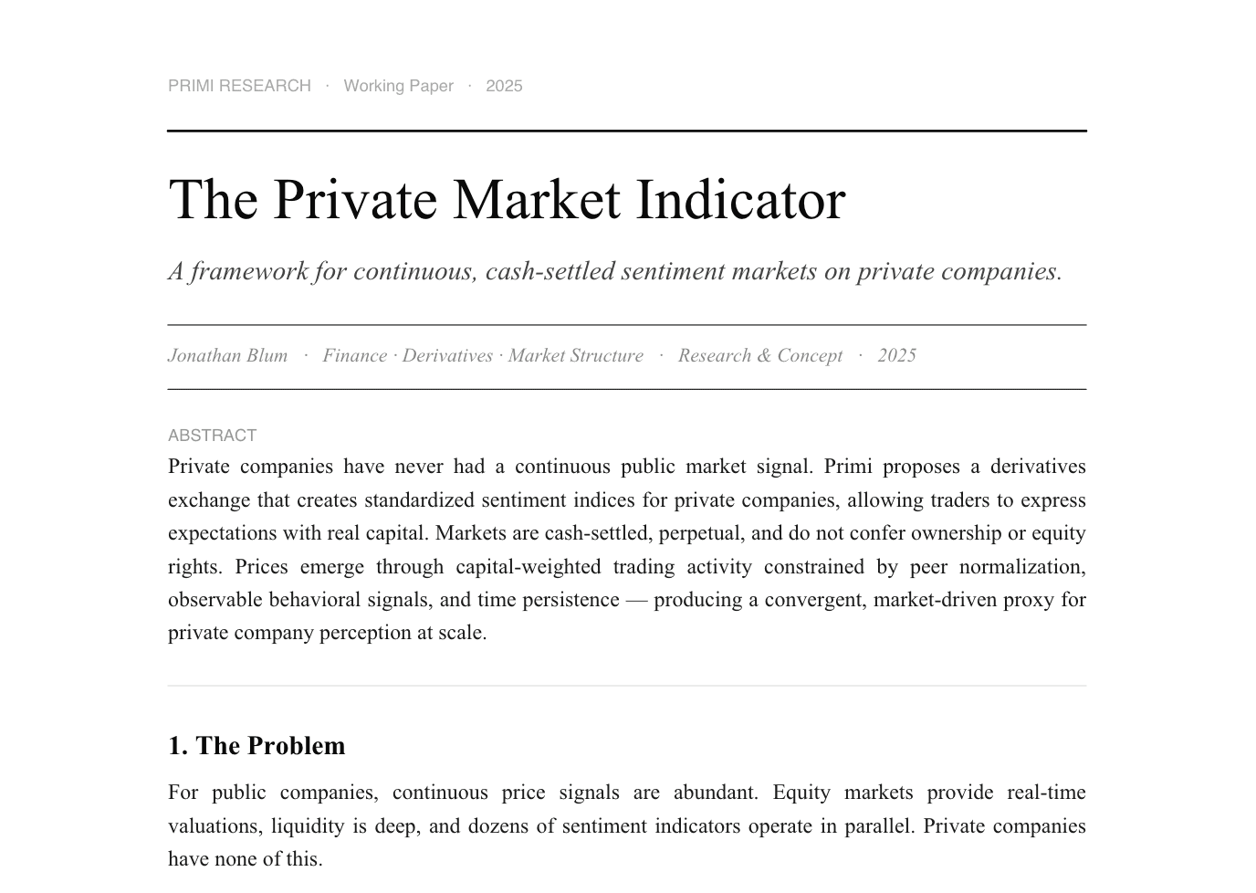 PRIMI is the first ever derivatives exchange that creates a continuous sentiment market for private companies. It turns expectations about startups and late-stage firms into a tradeable, cash-settled index, giving the private market a public signal.